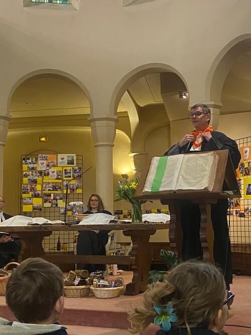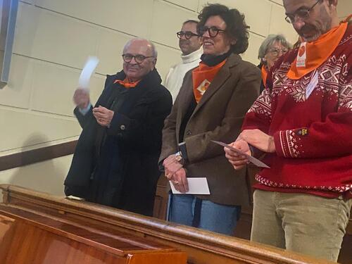 Les paroissiens sont venus nombreux pour ce culte-famille de février pour célébrer cet anniversaire de 70 années d’engagement pour la diaconie dans notre paroisse. La tribune du temple était remplie de bénévoles heureux portant leur traditionnel foulard orange. Cet élan d’accueil et de partage a été rappelé par plusieurs interventions rappelant l’histoire de notre association d’Entraide, les perspectives pour son avenir, dans un monde toujours plus marqué par la précarité.