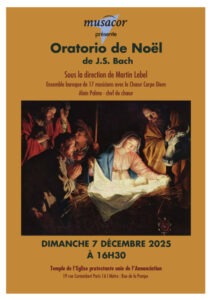 Dimanche 7 décembre à 16h30 au temple, Musacor vous propose un concert exceptionnel : l’Oratorio de Noël de Bach, par … Lire l’article