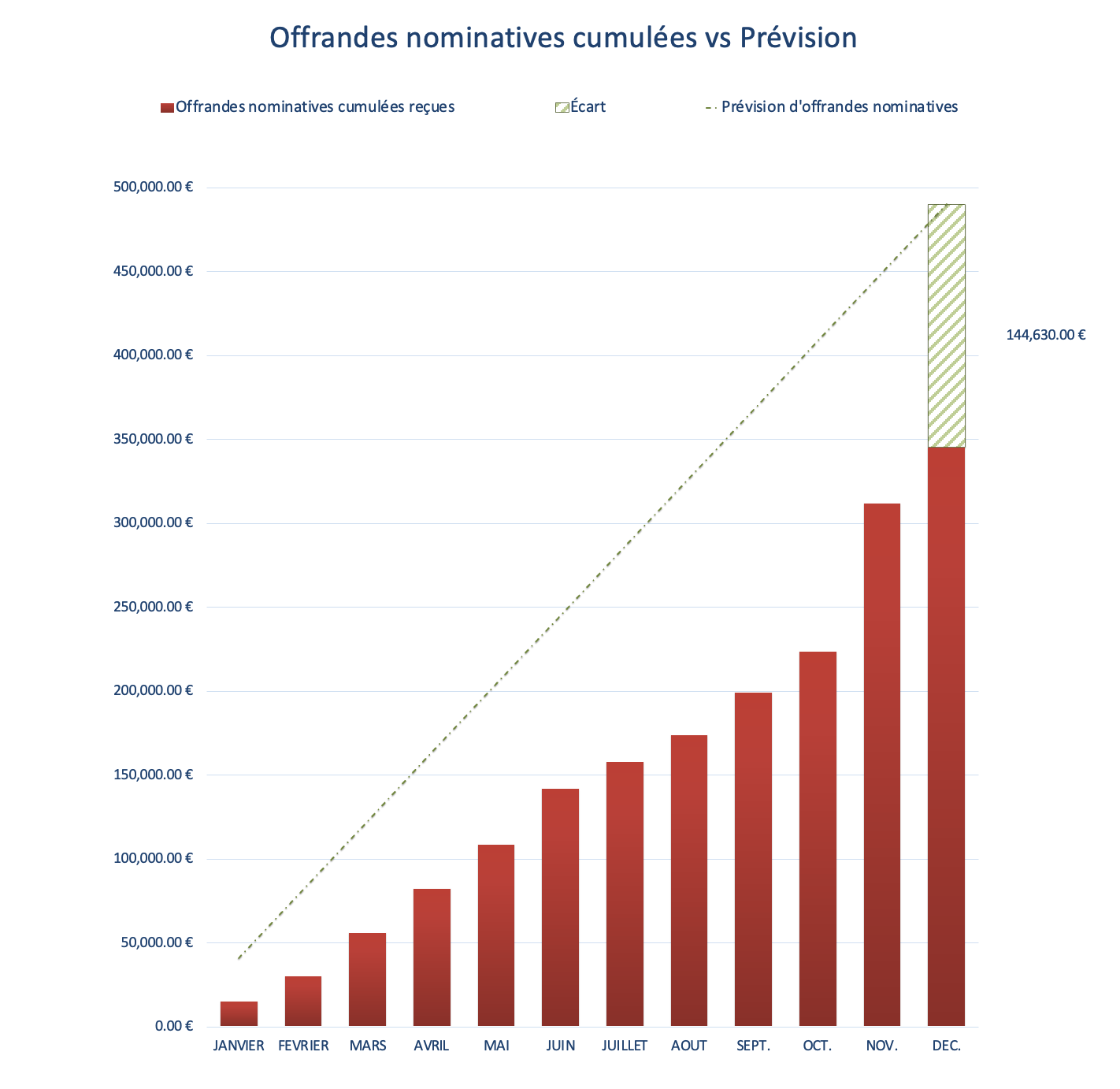 A l’heure où nous entamons notre sprint final vers la clôture de notre année comptable, voici un état des lieux de nos rentrées d’offrandes nominatives : nous avons reçu un peu plus de 345 000 € sur les 490 000 € de notre prévision.