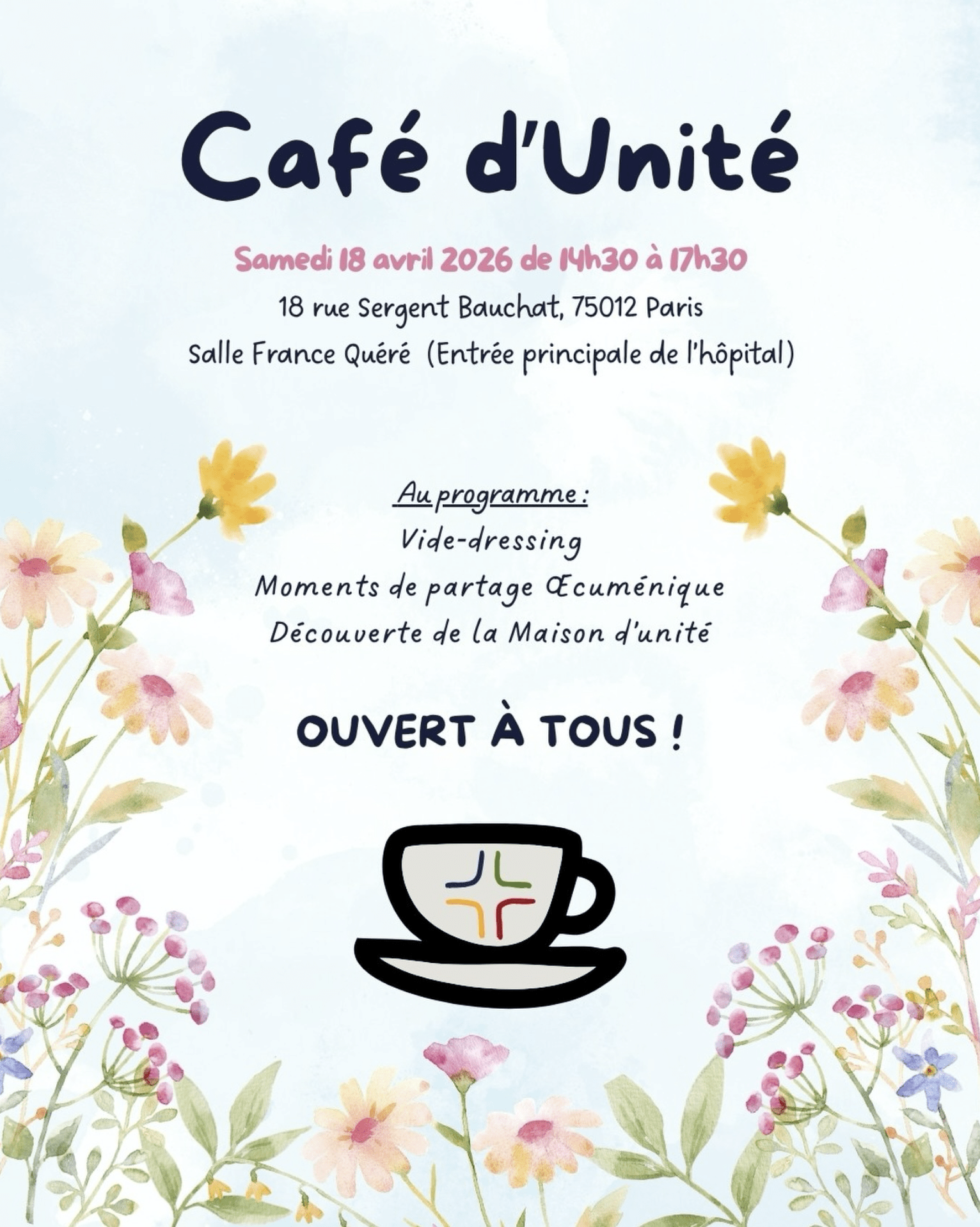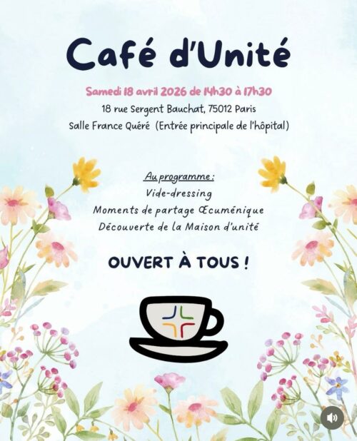 Samedi 18 avril à partir de 14h30, la Maison d’Unité propose un café d’unité. Autour d’un vide-dressing, venez vivre des moments de partage œcuménique et découvrir la Maison d’Unité. Lieu : 18 rue Sergent Bauchat, 75012 Paris (salle France Quéré, accès par l’entrée principale de l’hôpital).